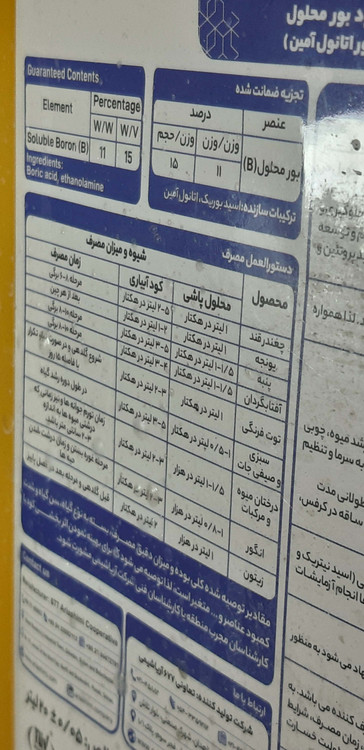 - میزان مصرف اسید بوریک به صورت محلول پاشی به صورت محلول پاشی میزان 2 تا 2.5 لیتر در هزار لیتر می باشد