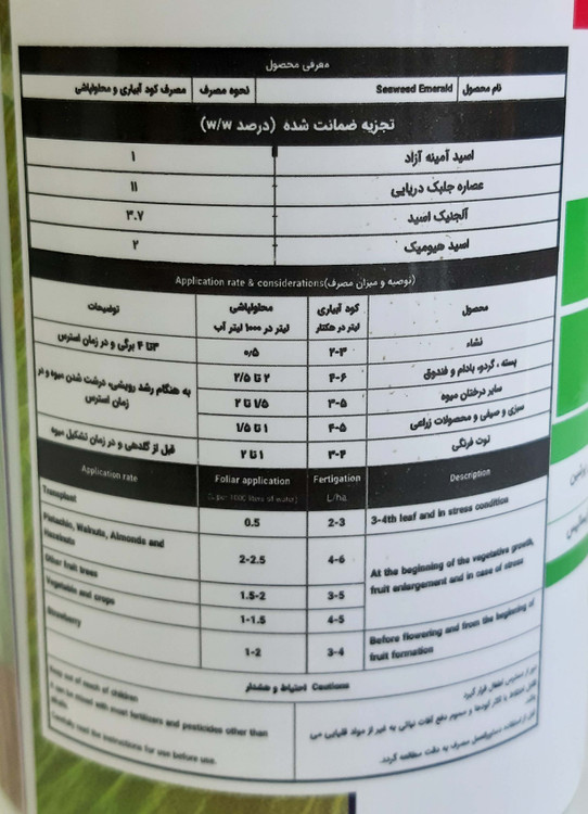 کود عصاره جلبک دریایی که با اسیدهای امینه،کلسیم و ماده الی غنی شده می تواند به عنوان یک تقویتی و انتی استرس و محرک رشد گیاه و بهبود گل انگیزی و گرده افشانی و توسعه ریشه می شود در محصولات کشاورزی استفاده کرد